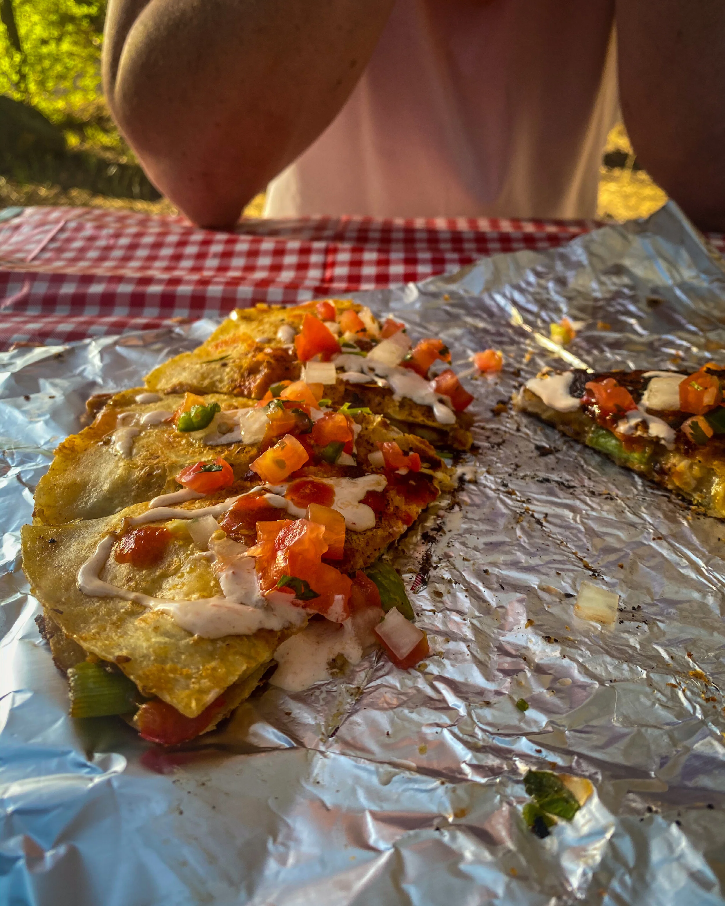 Cast Iron Quesadillas are a fast and versatile camp option. Easy instructions for this fast lunch or light dinner are below. You can get creative and mix up any fillings you can dream of. It’s also a great way to use up any produce in your cooler that you might have. I personally know overpacking my cooler with produce is a real problem when camping. I had good intentions when I packed it, but much of the time there’s some lingering when my trip ends.